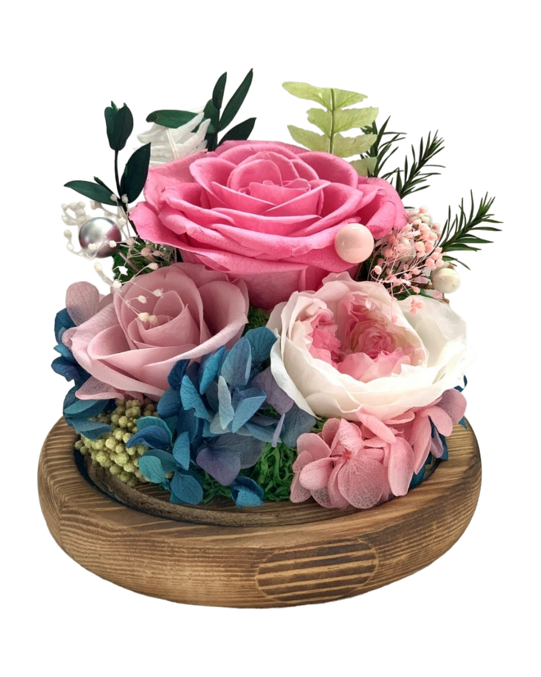 • Handcrafted preserved floral arrangement in a glass ball dome